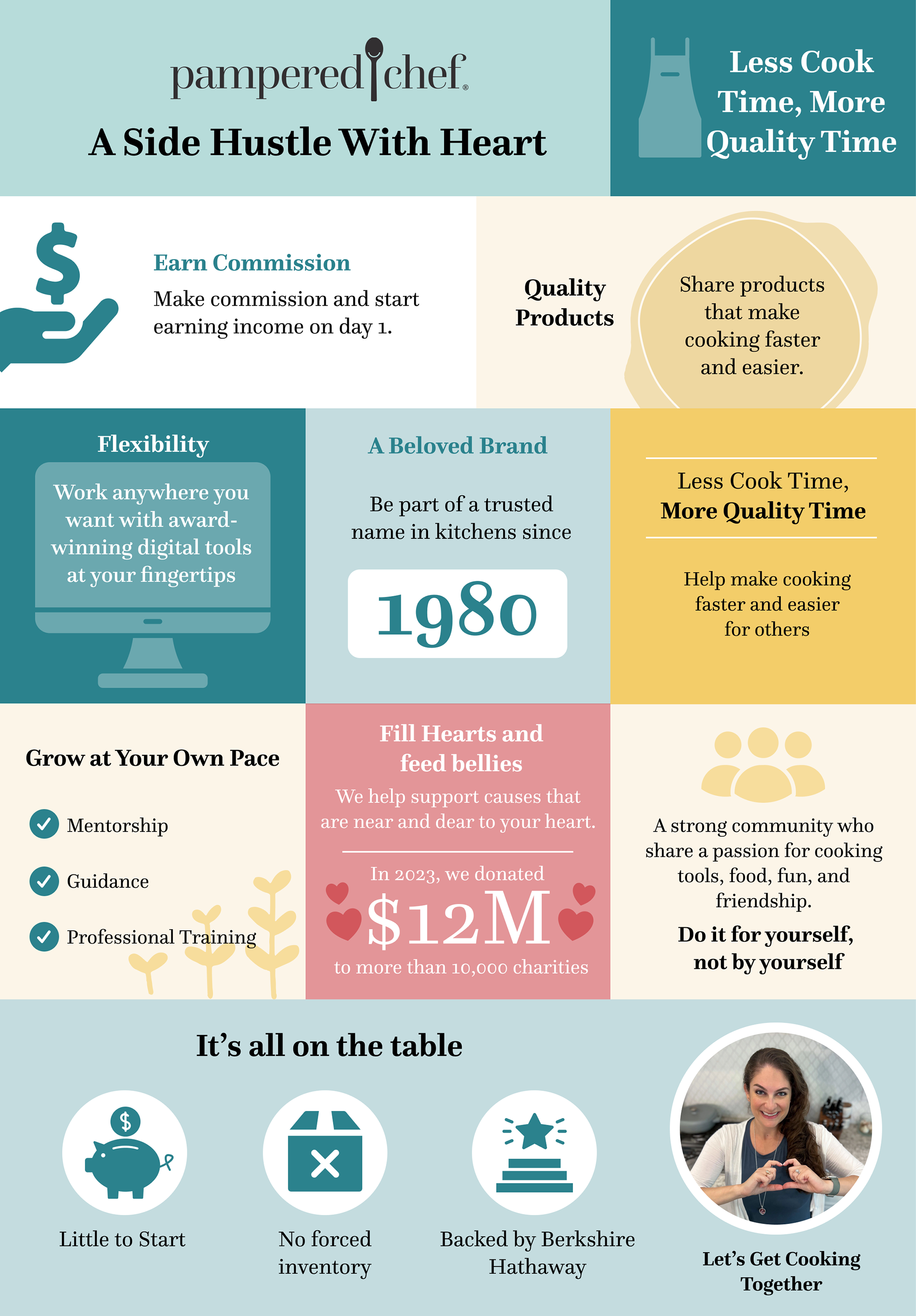 Un-used concept for a manifesto infographic about Pampered Chef. Biggest goals were to reinforce the brand's trustworthiness and clearly communicate "what's in it for me?" An editable circle was left at the bottom for current consultants to place their own picture in before sharing.